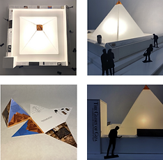 This exhibition design showcases various artifacts discovered at the Pyramids of Giza. At its center is a large, glowing pyramid designed to capture the audience's attention. Surrounding the pyramid, the artifacts are displayed alongside panels and screens providing additional information. Visitors will also receive a foldable giveaway that transforms into a pyramid shape, containing details about the artifacts and the Giza pyramids.
